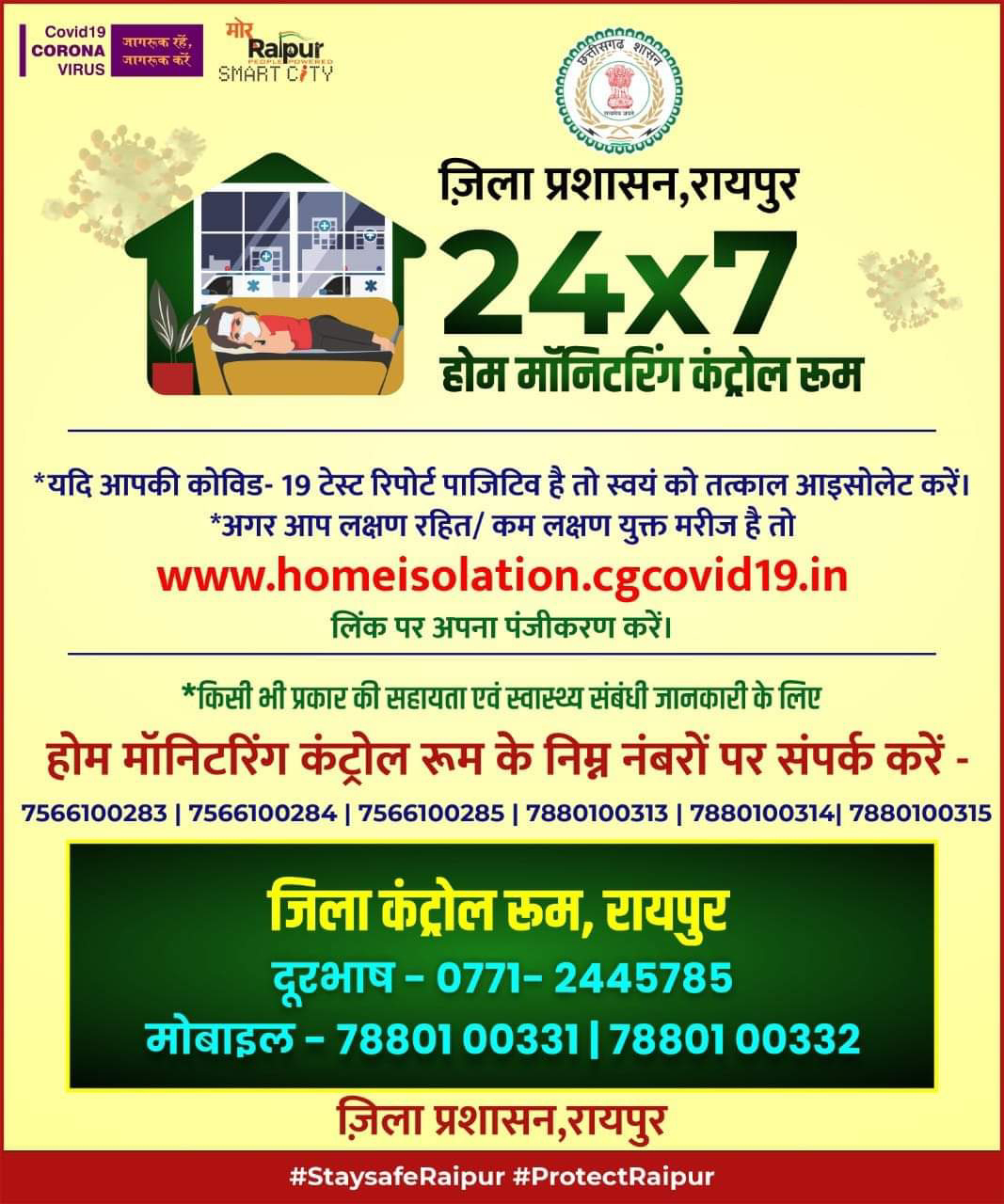 रायपुर, जिला प्रशासन की अपील- कोविड पॉजिटिव होने पर पोर्टल के लिंक http://homeisolation.cgcovid19.in पर या कंट्रोल रूम के नम्बर 07712445785,7880100331, 7880100332 पर अवश्य दें अपनी सही जानकारी